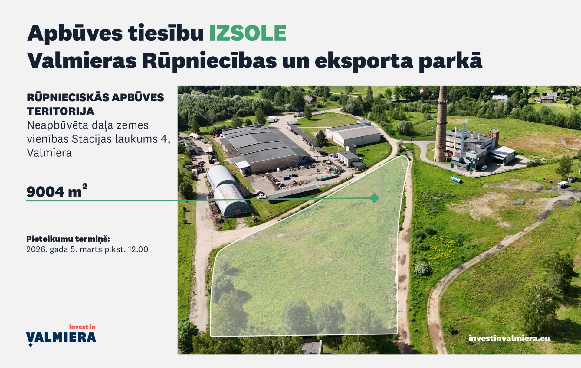 Valmieras novada pašvaldība (turpmāk – Pašvaldība) izsludina otro mutisko apbūves tiesību izsoli uz izsoles objektu – neapbūvētu daļu no zemes vienības, kadastra apzīmējums 9601 013 2210, aptuveni ...