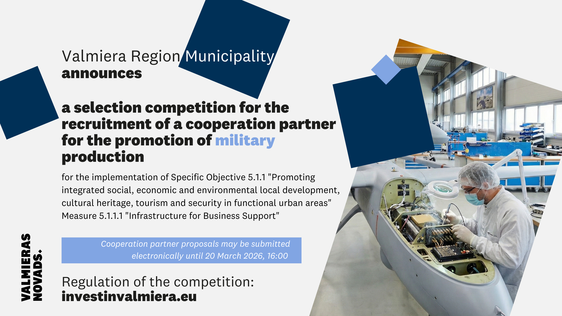 Valmiera Region Municipality announces a selection competition for the recruitment of a cooperation partner for the implementation of the project application “Development of Industrial Territories in Valmiera State City – Promotion of Military Production” within Measure 5.1.1.1 “Infrastructure for Business Support”